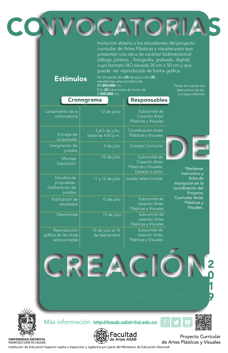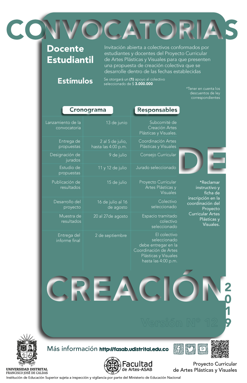 El Subcomité de Creación del Proyecto Curricular de Artes Plásticas y Visuales de la Facultad de Artes ASAB de la Universidad Distrital Francisco José de Caldas invita a sus estudiantes y docentes a consultar y participar de las convocatorias de creación: Docente-Estudiantil, Curaduría Estudiantil y Lorenzo Jaramillo que se describen a continuación: