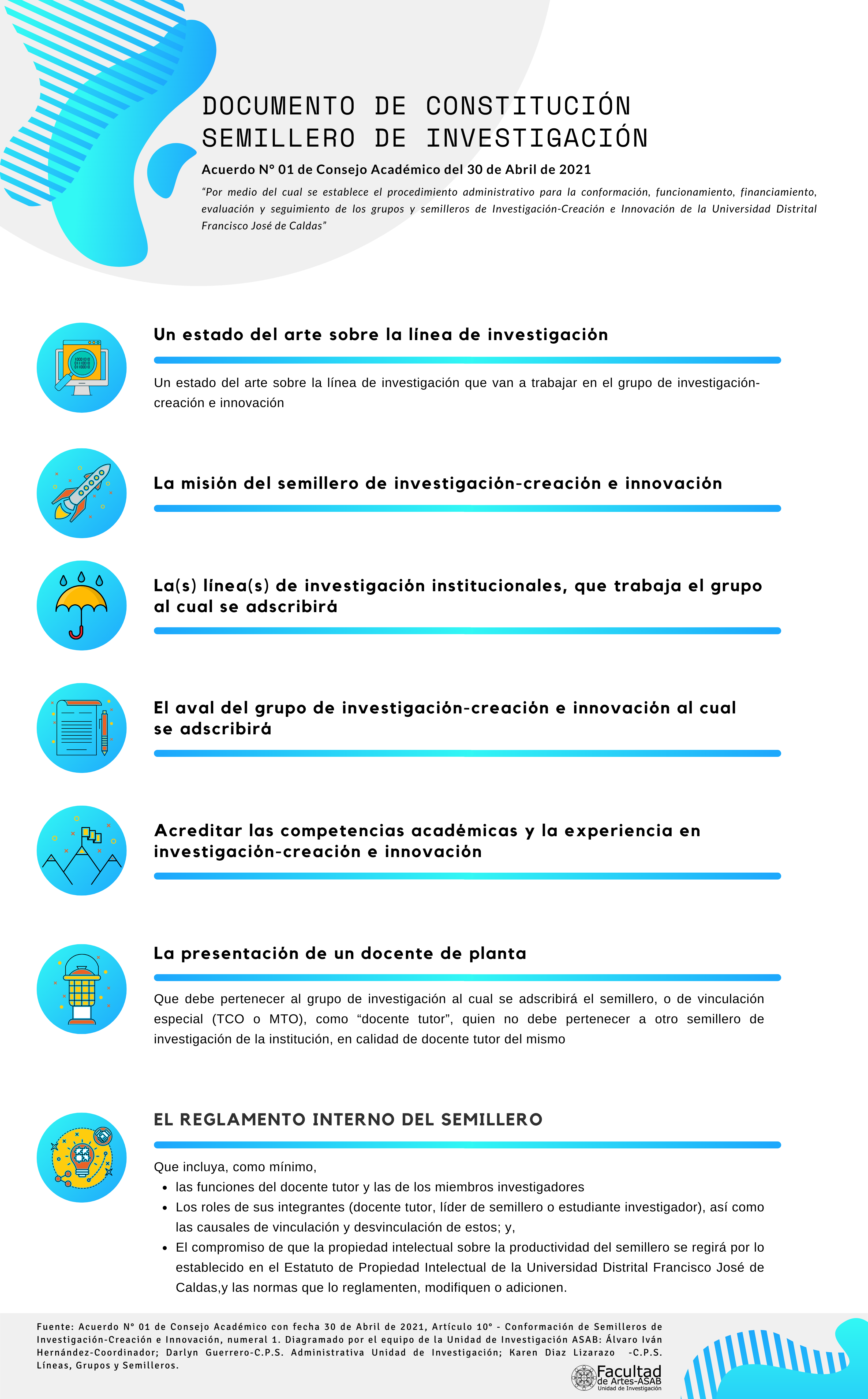 - Acuerdo No. 01 (Abril 30 de 2021) "Por medio del cual se establece el procedimiento administrativo para la conformación, funcionamiento, financiamiento, evaluación y seguimiento de los grupos y semilleros de investigación-creación e innovación de la Universidad Distrital Francisco José de Caldas". Consulte, aquí.